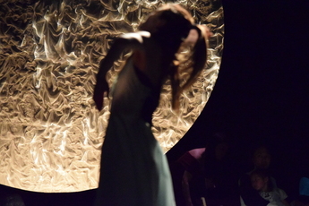 巨大な満月のセット。大串聡覧さんがドビュッシー作曲のピアノ曲「月の光」を演奏し、千津子さんが踊ります。